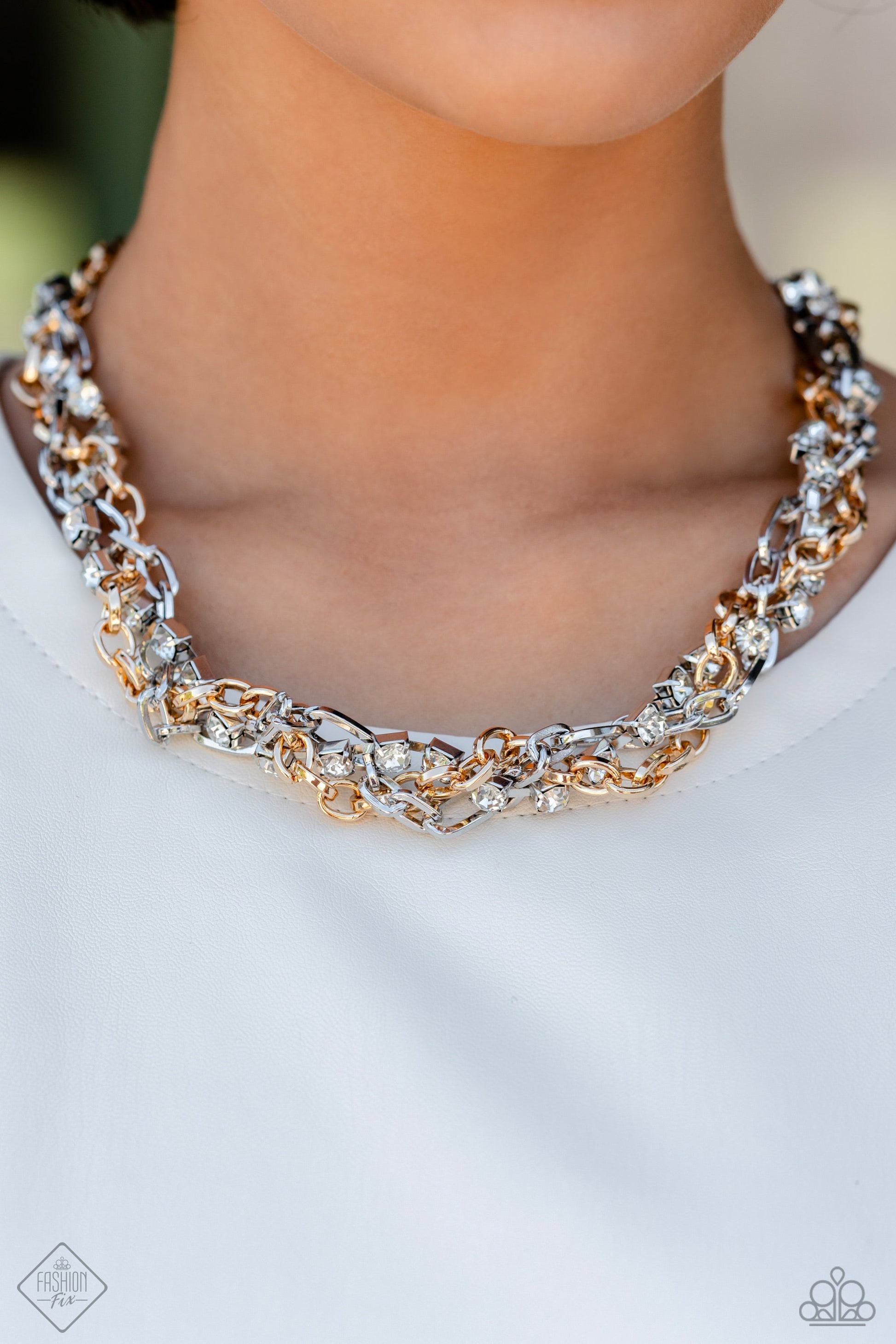 Mismatched strands of glistening gold and silver oval links are intertwined with a row of sparkling, square-cut, white rhinestones encased in sleek silver fittings, resulting in a twisted collision of grit and glamour along the neckline. Features an adjustable clasp closure. Sold as one individual necklace. Includes one pair of matching earrings.